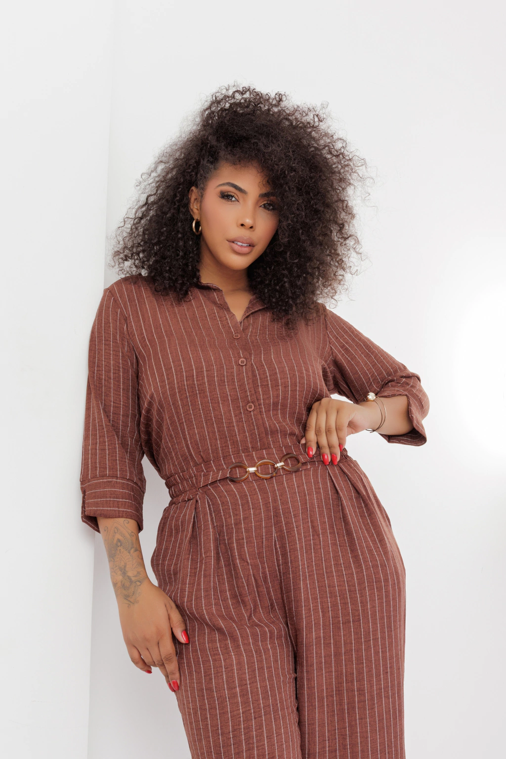 Conheça a Camisa Risca de Giz Manga 3/4 Marrom! Uma peça que grita elegância e conforto ao mesmo tempo.